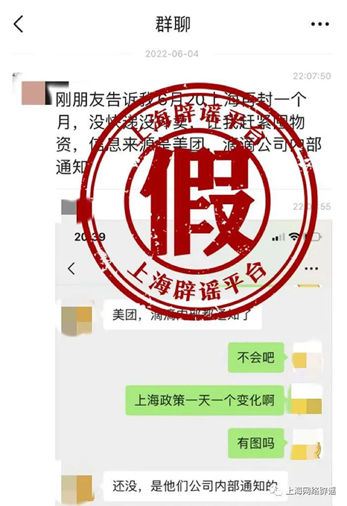 近日,微信圈群有传言称“6月20日上海再封一个月,没快递没外卖……信息来源是美团、滴滴公司内部通知”。上海辟谣平台向上海市新冠肺炎疫情防控工作领导小组办公室(简称“市防控办”)求证获悉,传言不实。上海全市目前没有这个安排。